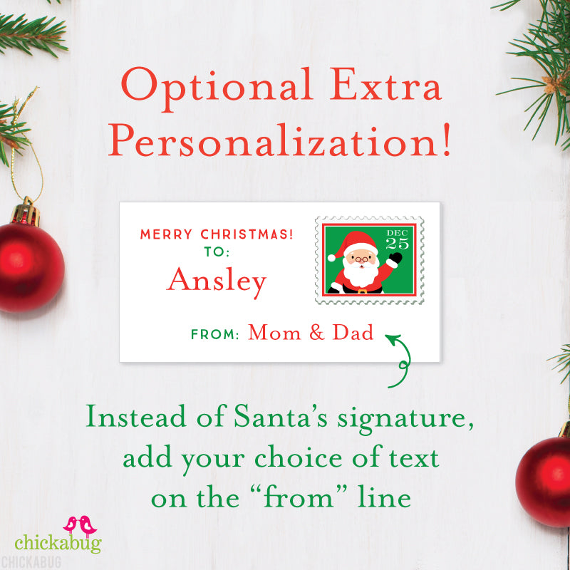 On the "FROM:" line, you can choose Santa Claus' REAL signature (it's really his – he works long hours in our shop signing each label himself) or you can specify your own text, which will be typeset in a red serif font.