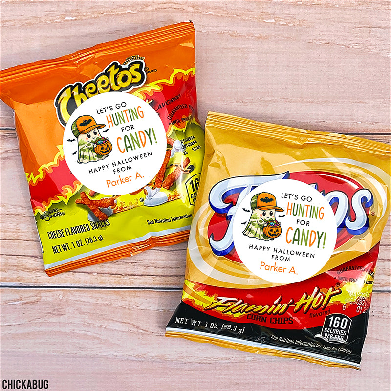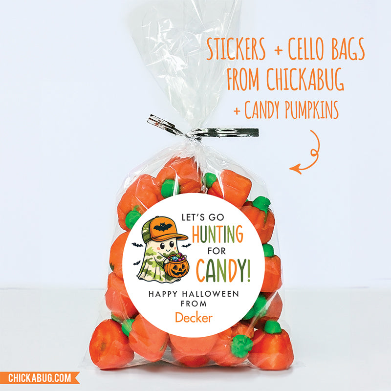 These adorable Halloween labels feature a hunter ghost in camouflage, wearing a camo hat and carrying a candy pail. The message reads "Let's Go Hunting for Candy!"