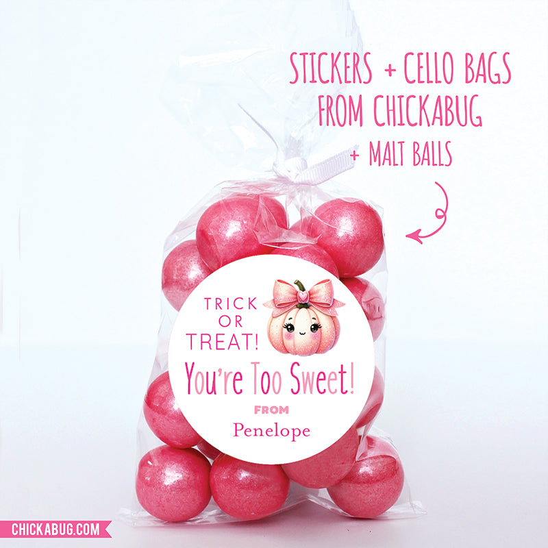 Make the cutest Halloween goody bags with personalized "Happy Halloween" labels! This design features an adorable pink pumpkin with a pink bow. The message reads "Trick Or Treat! You're Too Sweet!"
