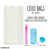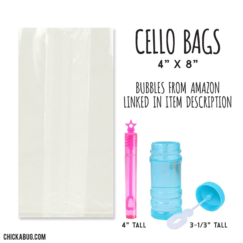 If you're purchasing favor bags from us, our bags measure 4"x8". These 4" tall bubble wands and these 3-1/3" tall bubbles are a few of the options for bubbles that fit in our favor bags.