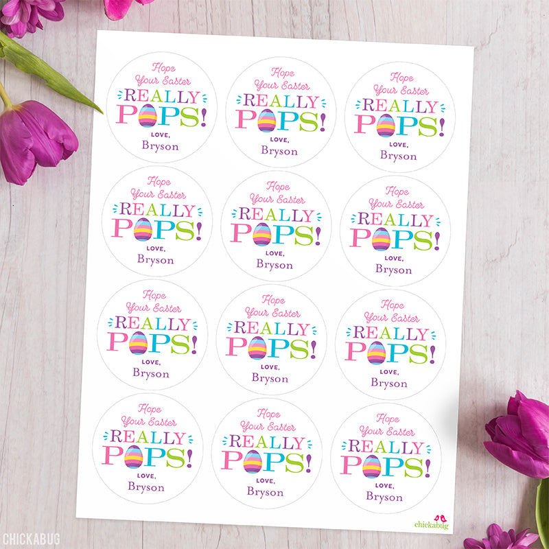 Personalized Easter labels are perfect for gifts, party favors, and more! This design features a multi-colored Easter egg and the phrase "Hope Your Easter Really Pops!" written in fun Easter tones. They pair perfectly with our favor bags (sold separately). Or, stick directly onto bags of popped or unpopped popcorn. Just peel, stick, and you're done!