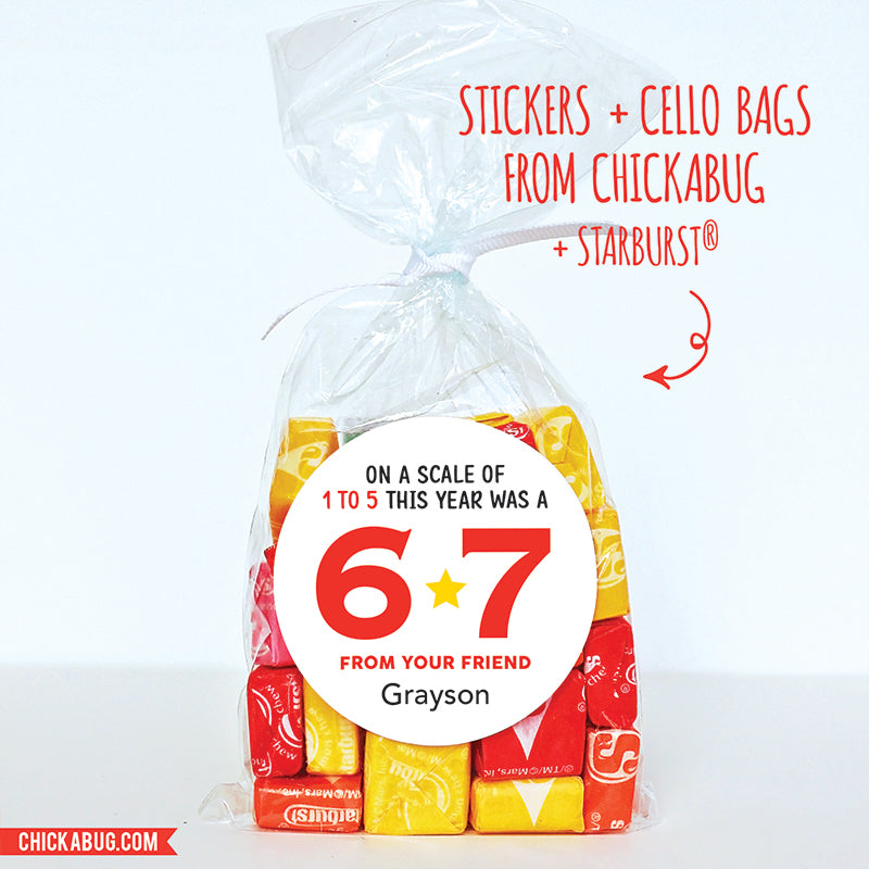 This design reads "On a Scale of 1 to 5 This Year Was a 6 7" in red and black text. Simply peel and stick onto favor bags (sold separately) and add the treats of your choice.